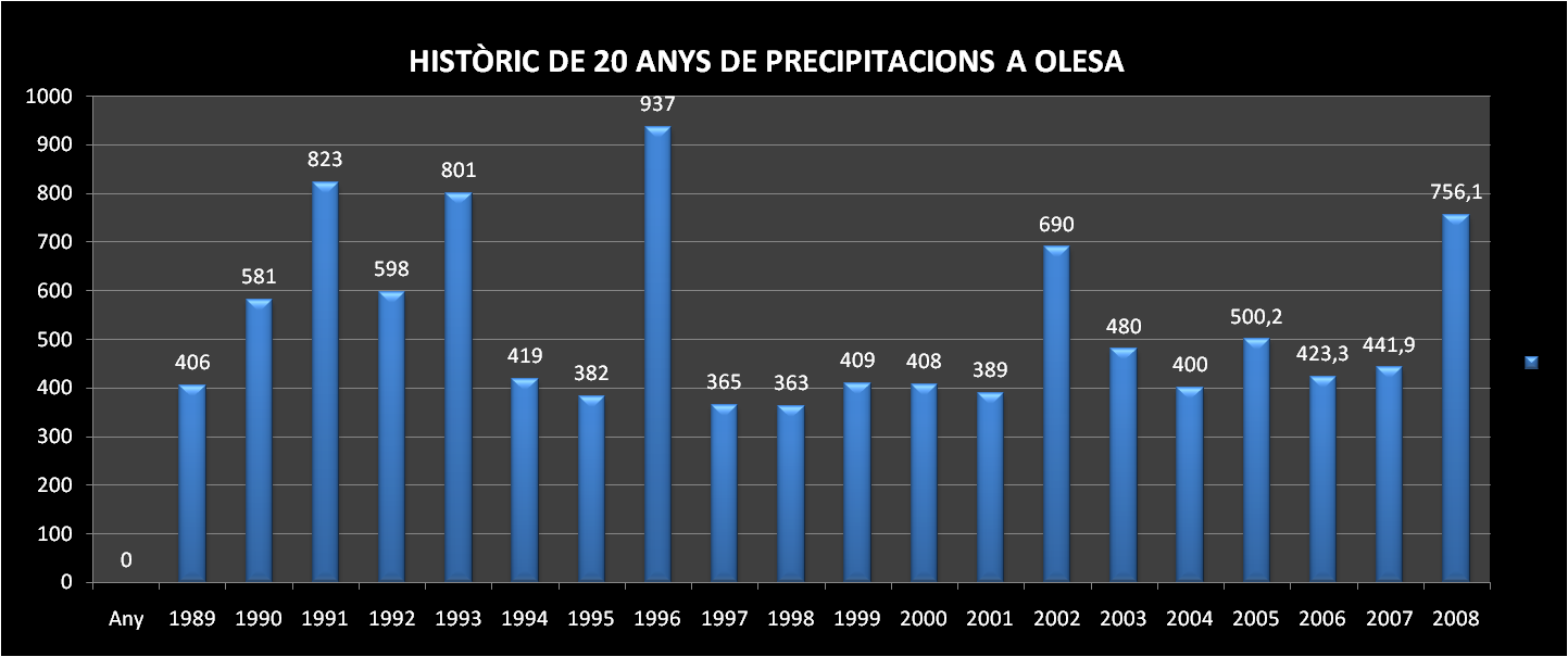 HISTÒRIC DE 20 ANYS DE PRECIPITACIONS A OLESA DE BONESVALLSAnys més plujós: 1996 amb 937 l/m2 Mes més plujós: Setembre de 1993 amb 248 l/m2 Dia més plujós 23 de setembre de 1993 amb 125 l/m2